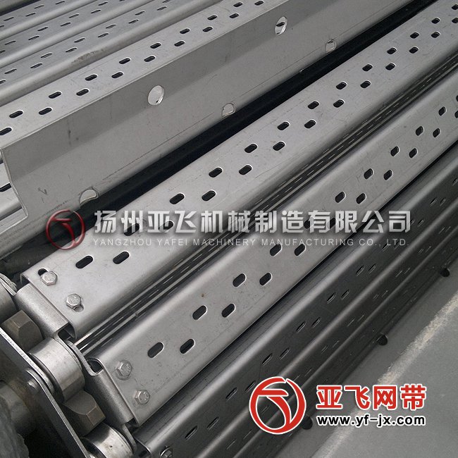 鏈條傳動(dòng)網(wǎng)帶是現(xiàn)國(guó)內(nèi)主要的一種輸送形式,根據(jù)不同的輸送要求設(shè)計(jì)兩側(cè)附帶各種規(guī)格的鏈條,中間加裝連接穿桿,加強(qiáng)輸送帶整體的負(fù)荷能力。