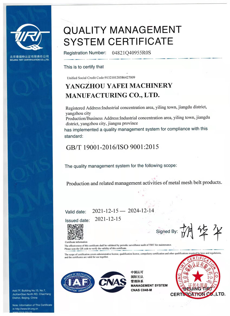 Yangzhou Yafei Machinery Manufacturing Co., Ltd. is a private scientific and technological enterprise in Jiangsu Province, formerly known as Yangzhou Yafei metal mesh belt factory. It is located in Yiling Industrial Park in the east of Yangzhou City, with R & D, production and processing, office buildings, etc. With independent research and development of scientific and technological projects and equipment processing and manufacturing capabilities.