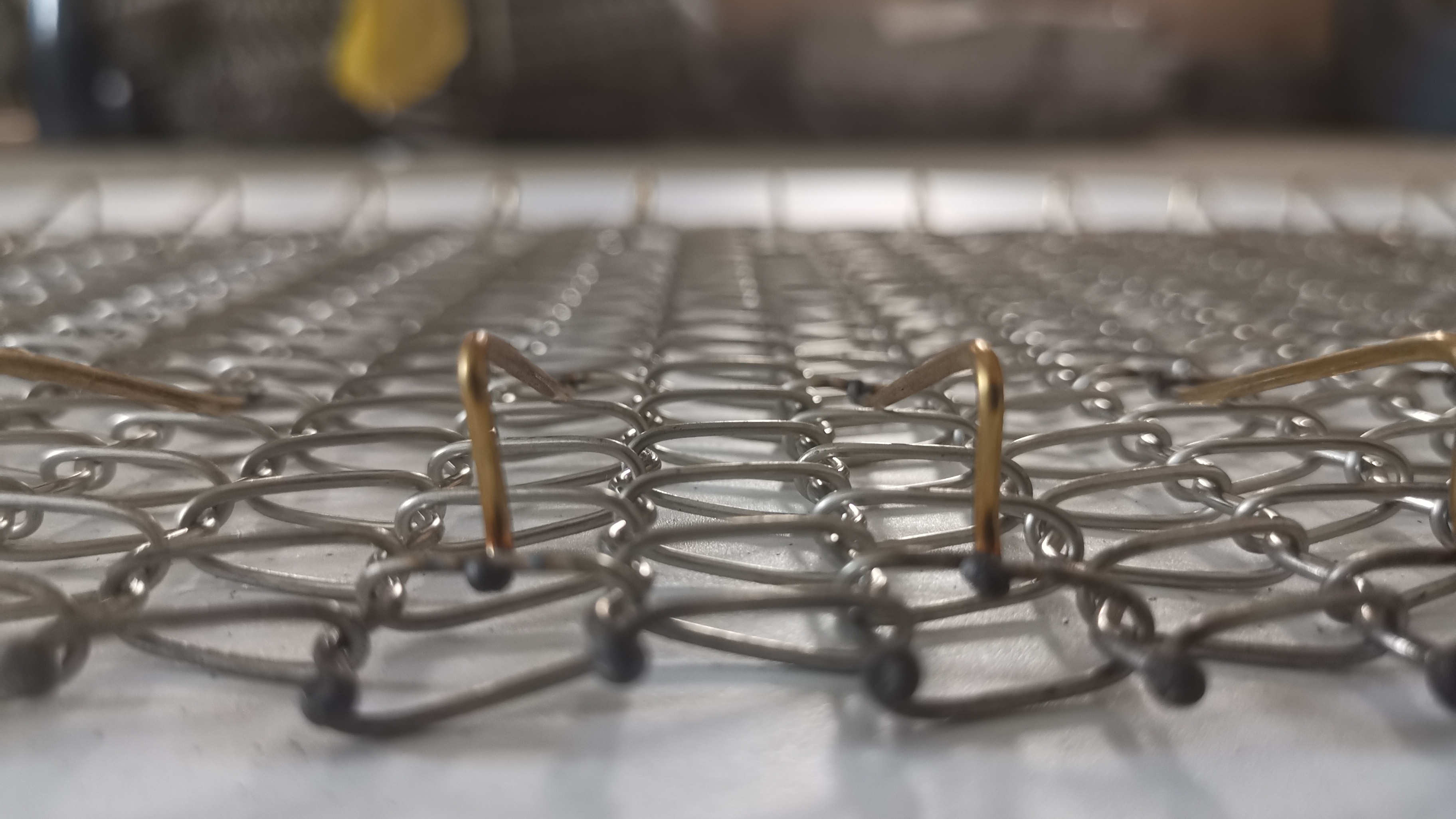 太陽(yáng)能電池片網(wǎng)帶主要使用耐高溫和抗腐蝕的軟性金屬網(wǎng)材料制成,并通過(guò)全自動(dòng)化的繞絲和穿絲設(shè)備生產(chǎn)出精確規(guī)格的繞絲和穿絲。網(wǎng)帶經(jīng)過(guò)穿絲過(guò)程后,完成成型。半成品清洗后,通過(guò)邊緣與頂針的焊接,完成整個(gè)網(wǎng)帶的生產(chǎn)。頂針通常會(huì)進(jìn)行鍍鈦處理,鍍金鈦的頂針的網(wǎng)帶多用于絲網(wǎng)印刷烘干爐,鍍黑鈦?lái)斸樀木W(wǎng)帶多用于電池片燒結(jié)爐。該網(wǎng)帶使用直徑1.0mm-直徑1.6mm的較細(xì)網(wǎng)絲,可以降低爐膛熱量損耗,增加電池片的受熱面積。